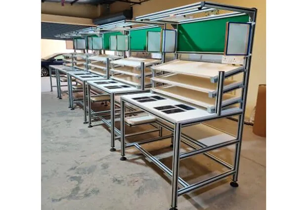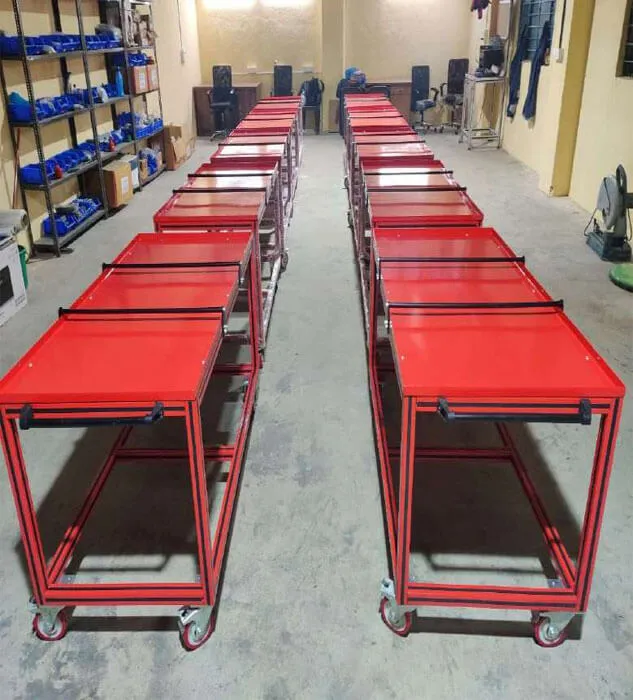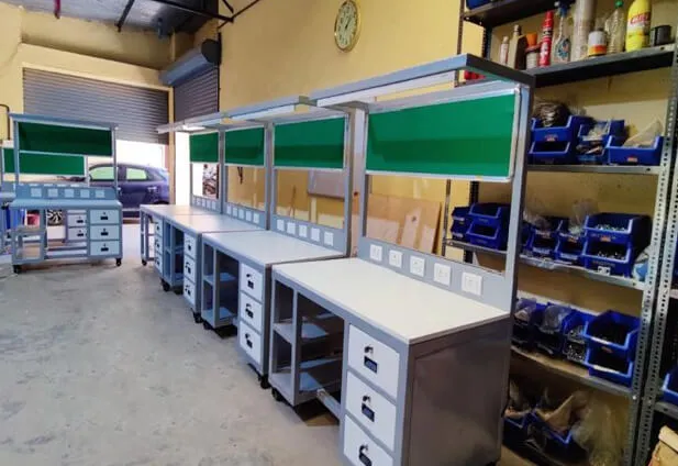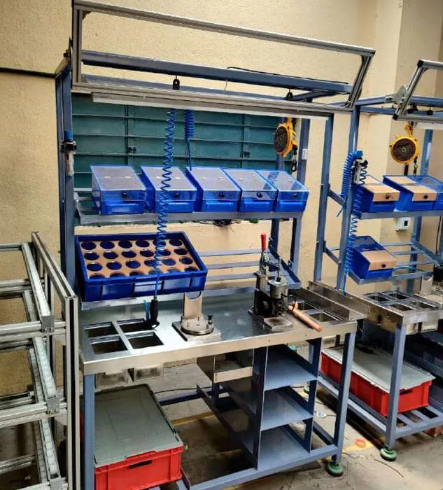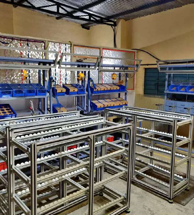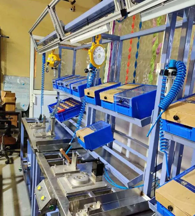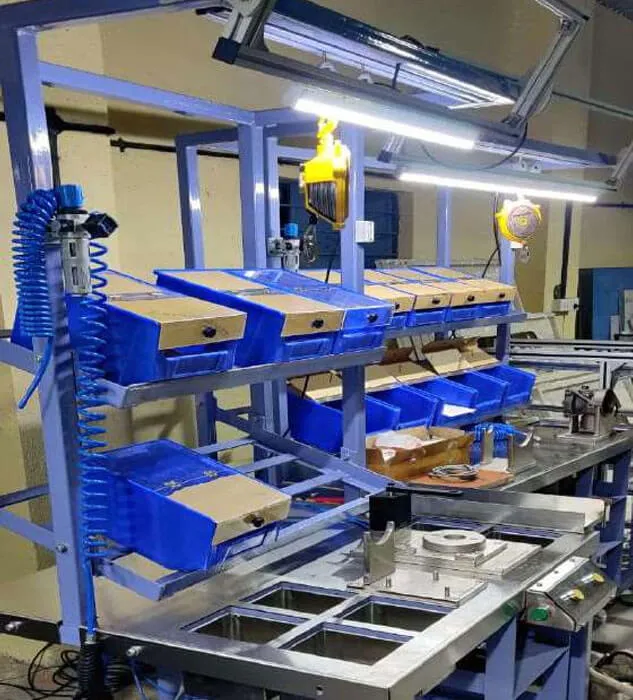 Complete assembly line with multiple stations, Flow Racks, Fixtures, Bolt tightening solutions, Power Tools, Special Tools for assembly, Spring Balancers, Workstations, Lightening arrangements, Bins and well equipped Rework station.
